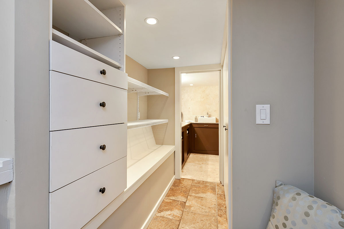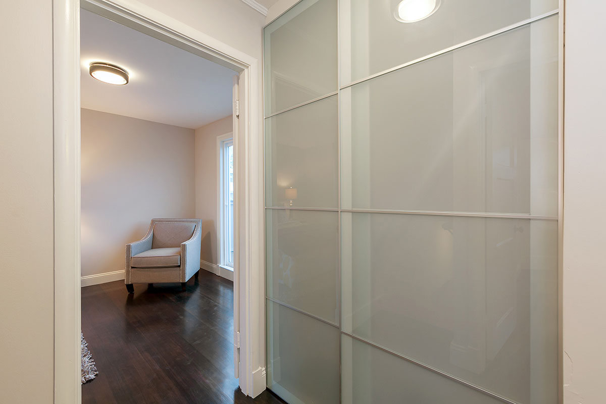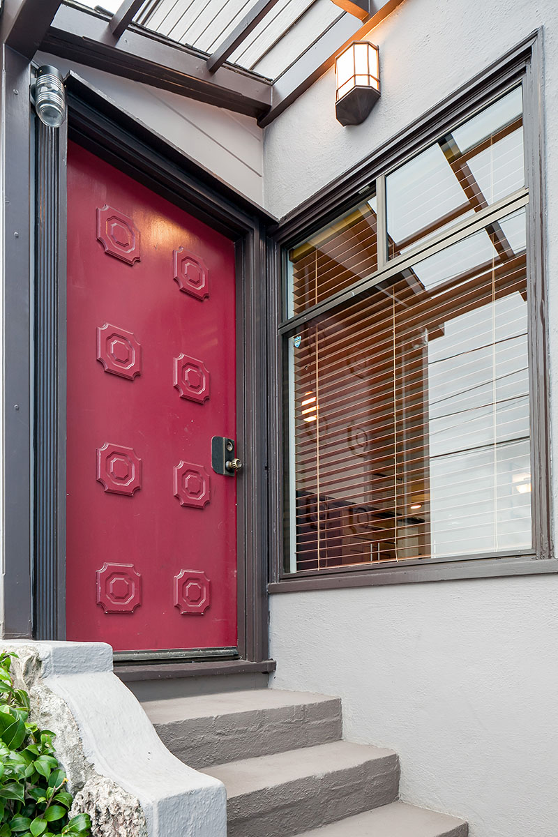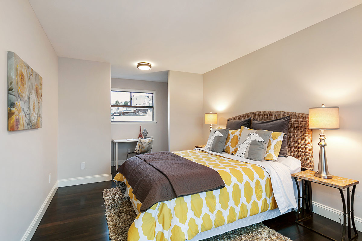 Sweeping broad stairs lead around and up to the upper level - with two additional bedrooms, a mod hall closet with frosted-glass sliding doors, and a fully outfitted bath. The master bedroom features a walk-in closet and a private roof deck with views of the city.