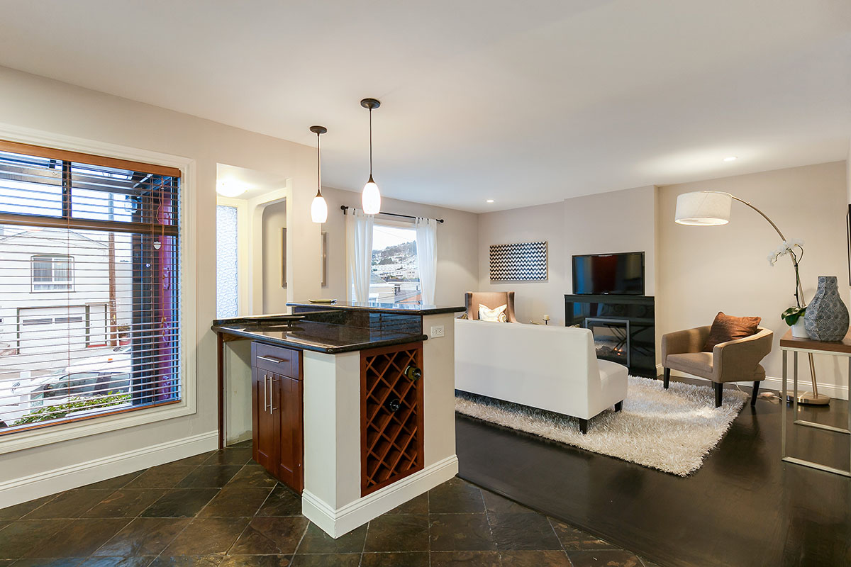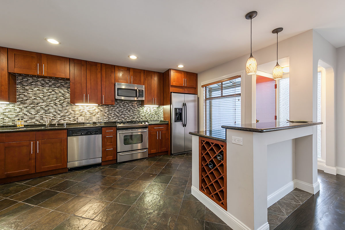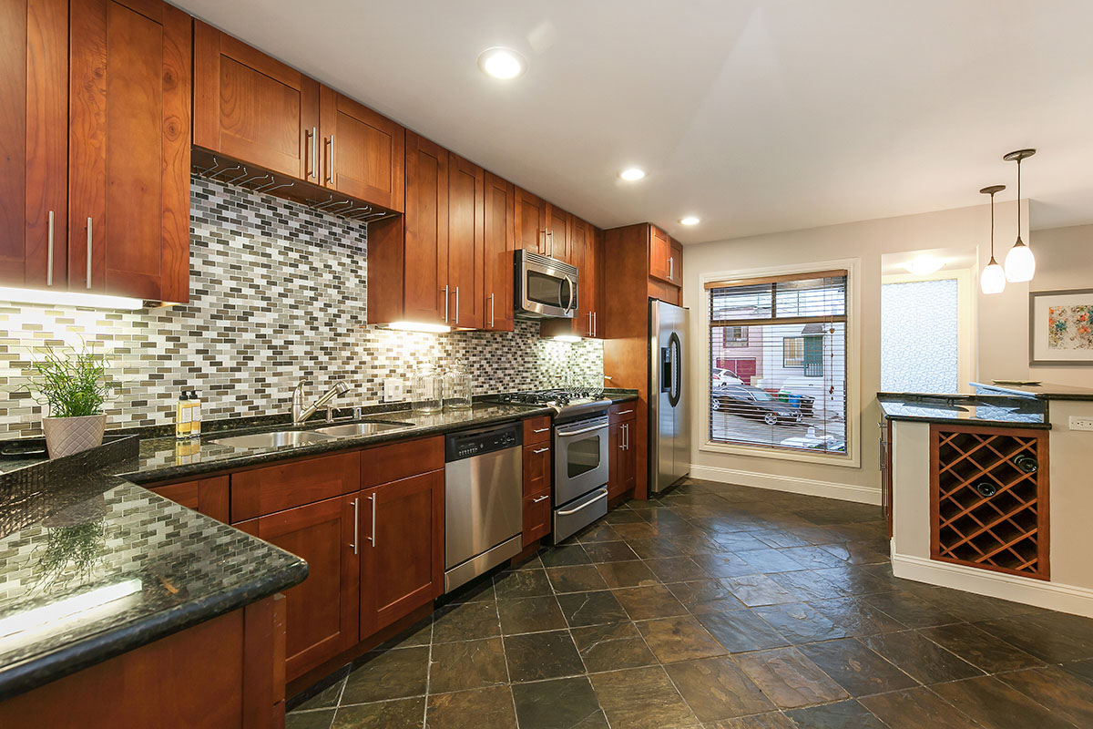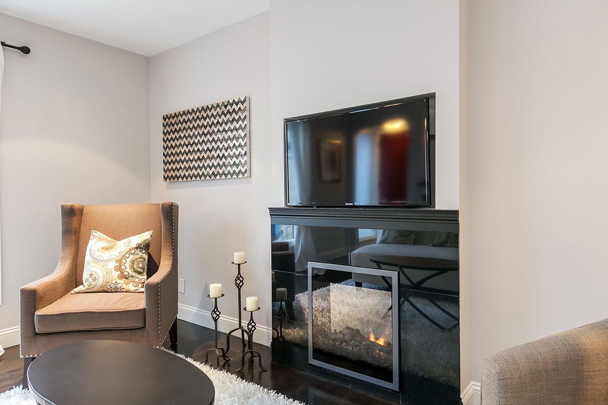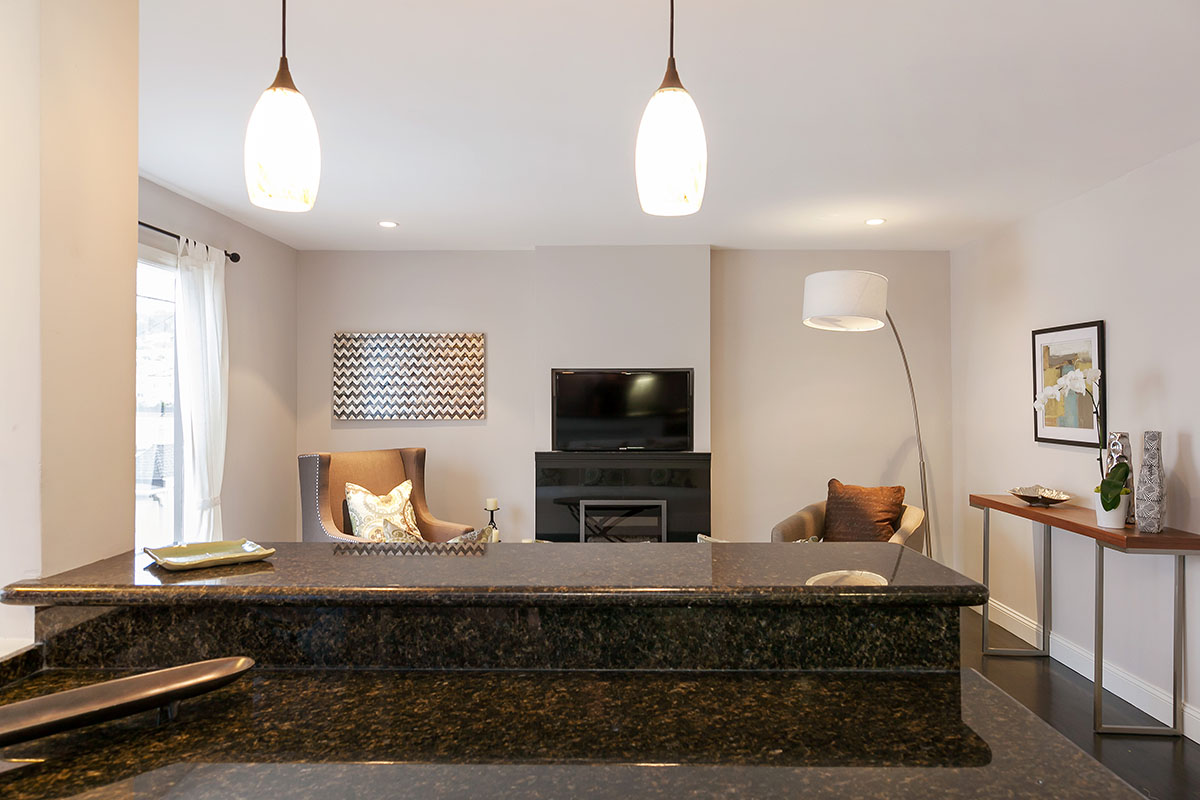 The open and flowing living area, dining area, and kitchen are bright and inviting offering the ultimate place to unwind and entertain. The luxurious state-of-the-art kitchen is well-appointed with sleek granite counters, stone tile flooring, professional stainless steel appliances, and rich wooden cabinetry. Casual countertop stool seating and the fresh, mod-style backsplash - make for a near perfect spot to pull-up with your morning cup-of-brew and MacBook Air to read the paper.;The open living room showcases a bright burning fireplace with a prominent granite surround. Completing the main living-level is a bedroom overlooking the rear garden and a full bath with a luxurious marble encased shower-over-tub and an attractive contemporary sink.