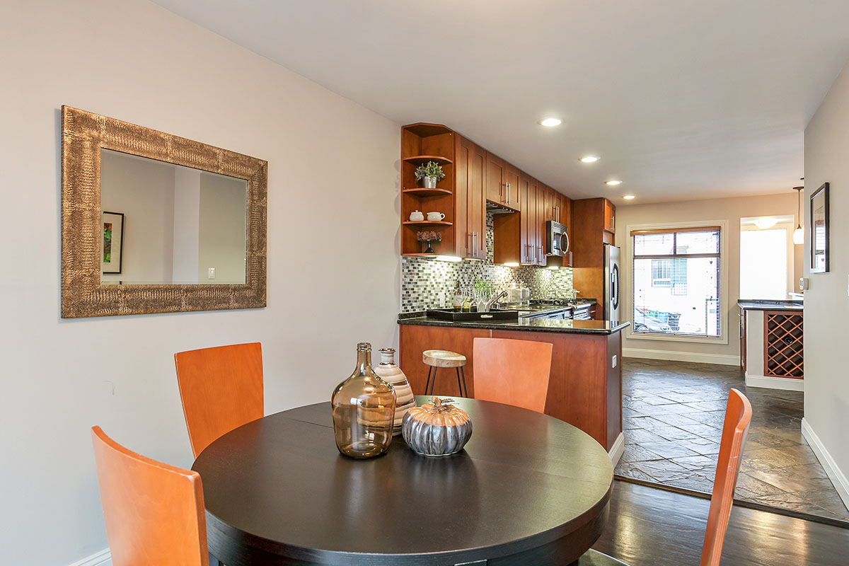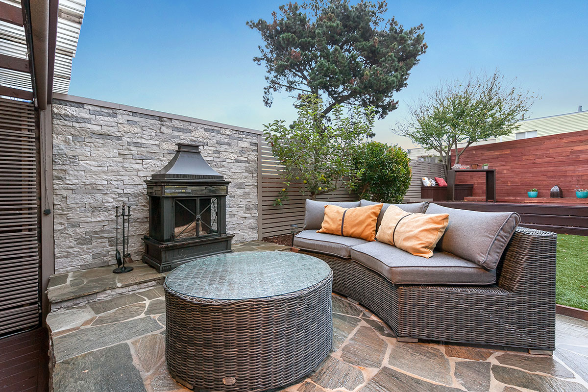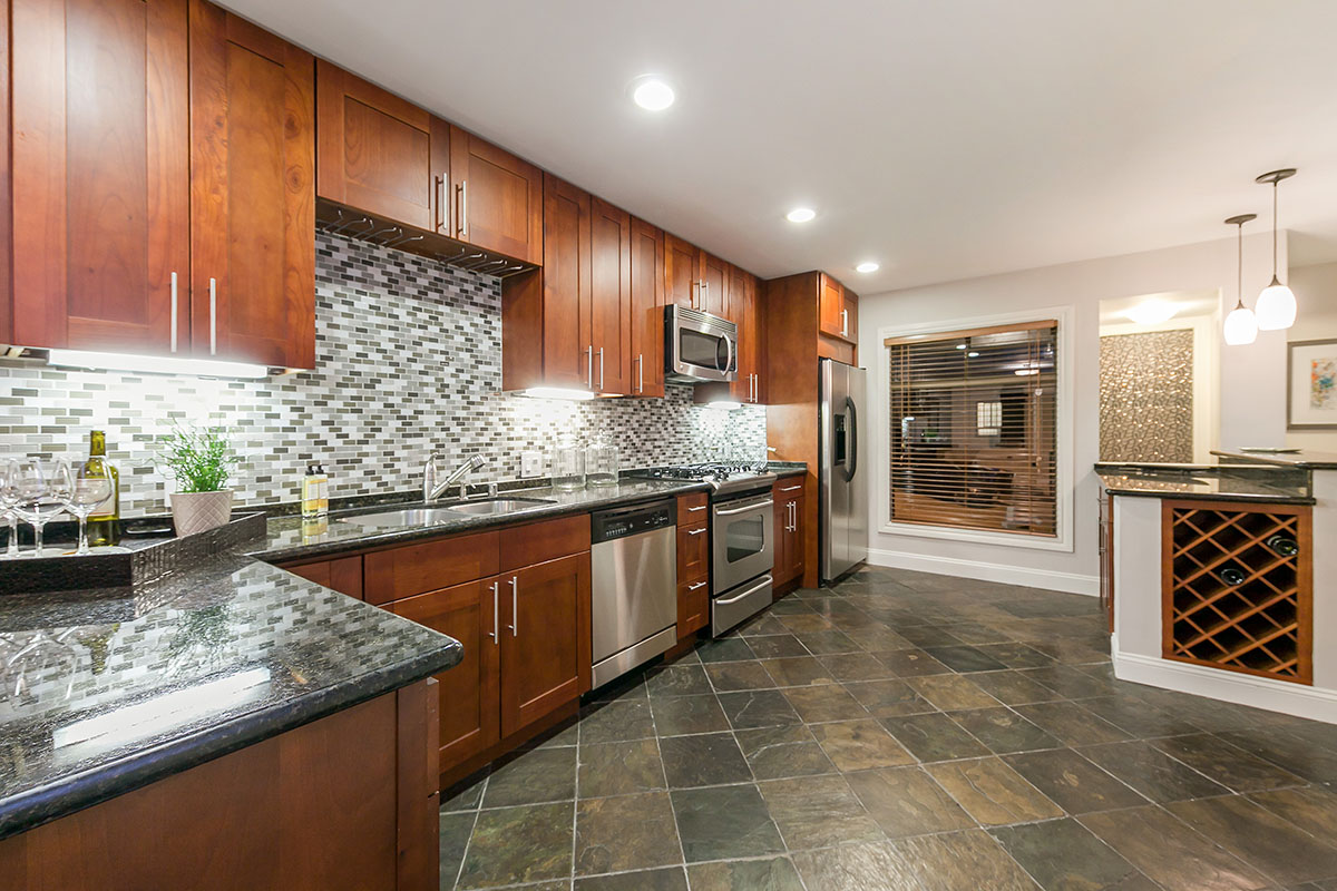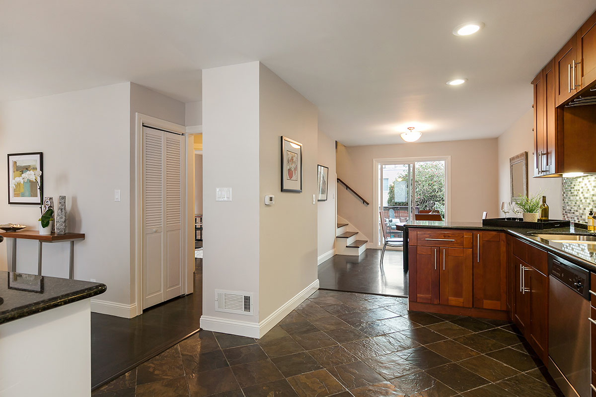 The open and flowing living area, dining area, and kitchen are bright and inviting offering the ultimate place to unwind and entertain. The luxurious state-of-the-art kitchen is well-appointed with sleek granite counters, stone tile flooring, professional stainless steel appliances, and rich wooden cabinetry. Casual countertop stool seating and the fresh, mod-style backsplash - make for a near perfect spot to pull-up with your morning cup-of-brew and MacBook Air to read the paper.;The open living room showcases a bright burning fireplace with a prominent granite surround. Completing the main living-level is a bedroom overlooking the rear garden and a full bath with a luxurious marble encased shower-over-tub and an attractive contemporary sink.