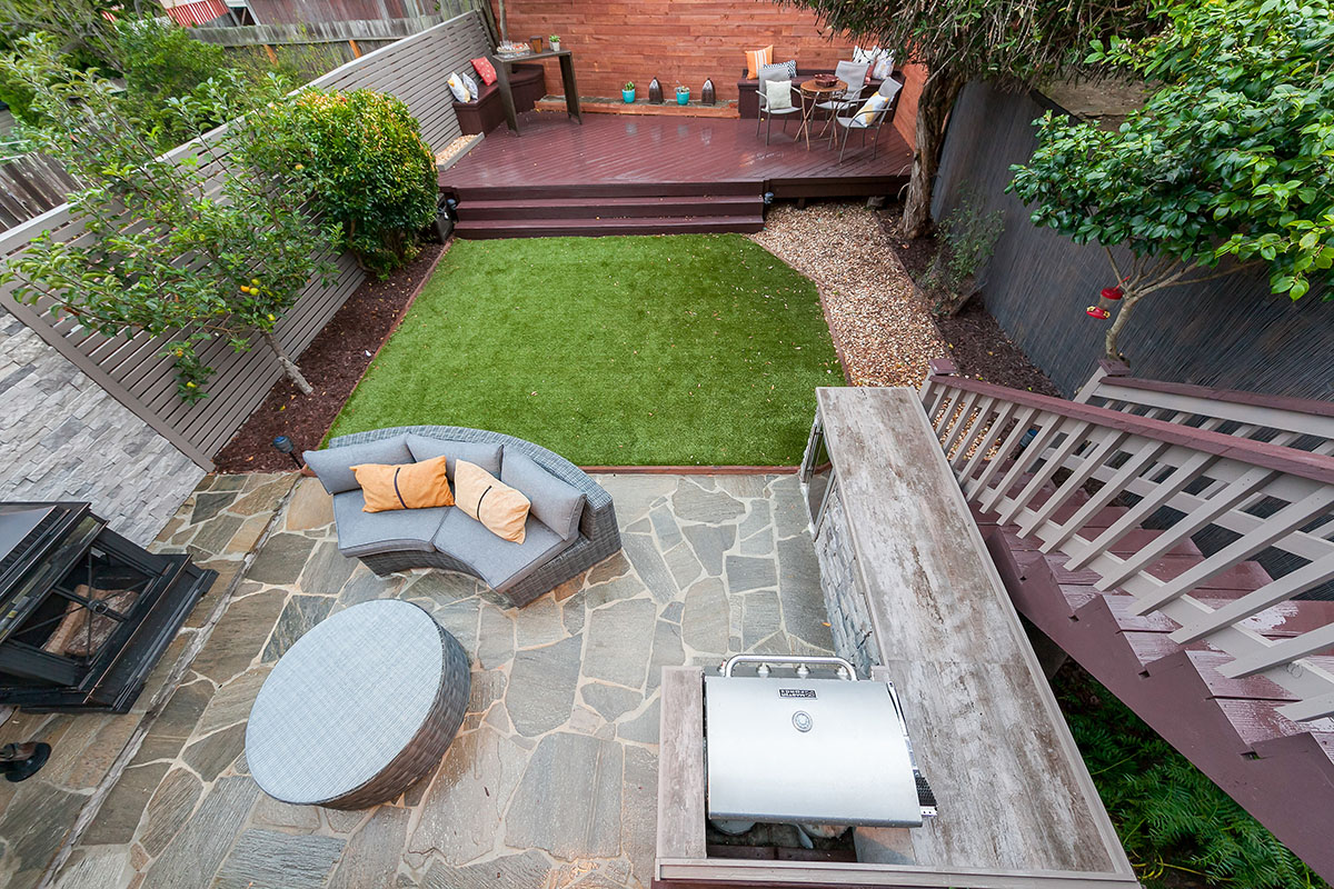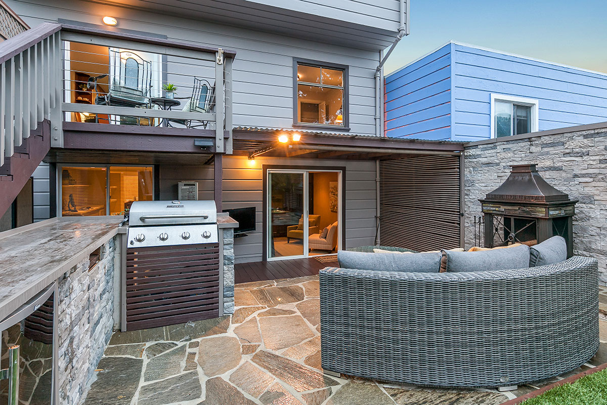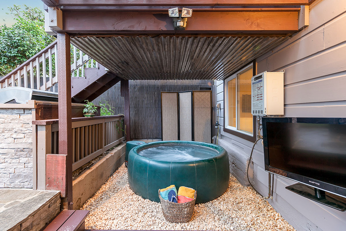 - Beautiful back garden w/ built-in BBQ bar with fridge, hot tub, fireplace, deck, stone patio, grassy area